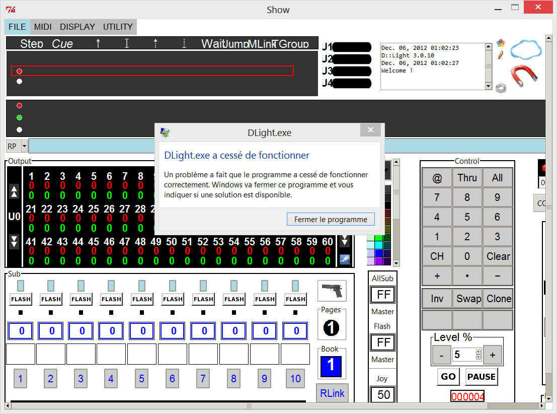 J'ai téléchargé la version 3.0.10 de D:Light, installé les drivers et j'arrive à communiquer avec mon boitier sans souci (test des channels ok)