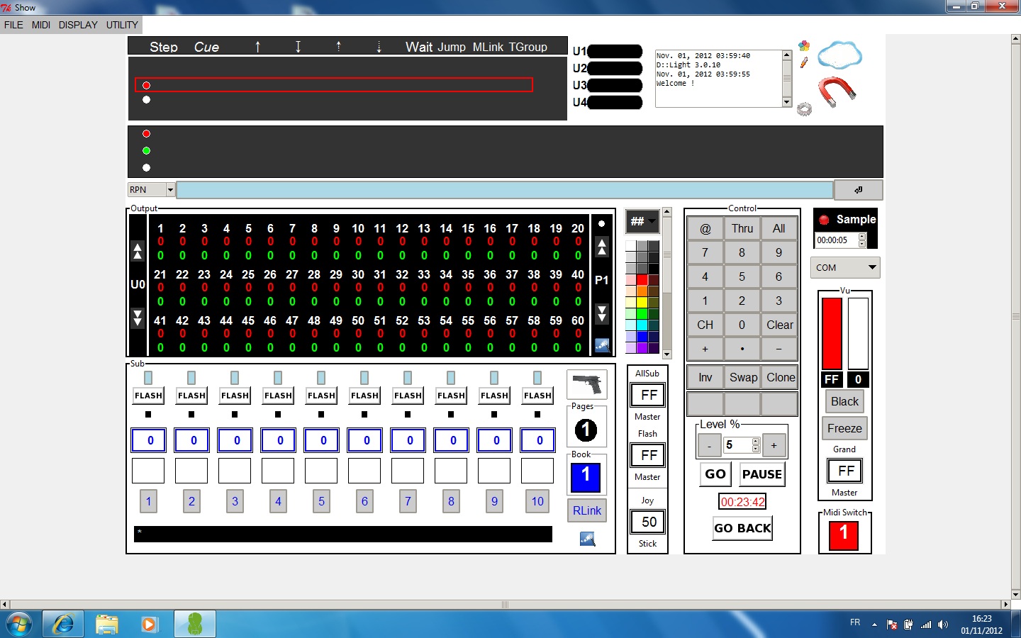 Salut tout le monde, il y a quelques jours je me suis acharné à faire fonctionner Dlight et Seqcon, merci à Renaud je crois d'avoir sorti le Dliht-seqcon, qui m'a permis d'y arriver, donc maintenant que tout cela marche je vais installer ca sur mon matos d'exploit (jusque la c'etait sur mon ordi maison) et là, ben Dlight dernier du nom ne veut pas charger de conduite et n'affiche aucun step et donc impossibilité d'en creer une, il ne veut pas non plus voir l'usbdmx, bref installation/desinstallation rien n'y fait, y aurait il quelque chose que j'ai loupé? l'ordi d'exploit est sur win7 merci.