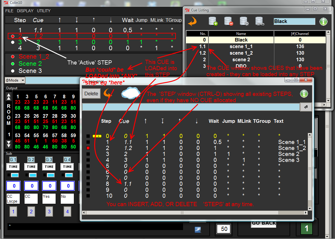 You now create a new lighting state, and record it as, say, CUE 2.1. Then, with your new STEP 3 'active' (Red Box again) you LOAD (whatever your keyboard shortcut is) CUE 2.1 into STEP 3 and set your Fade, etc times