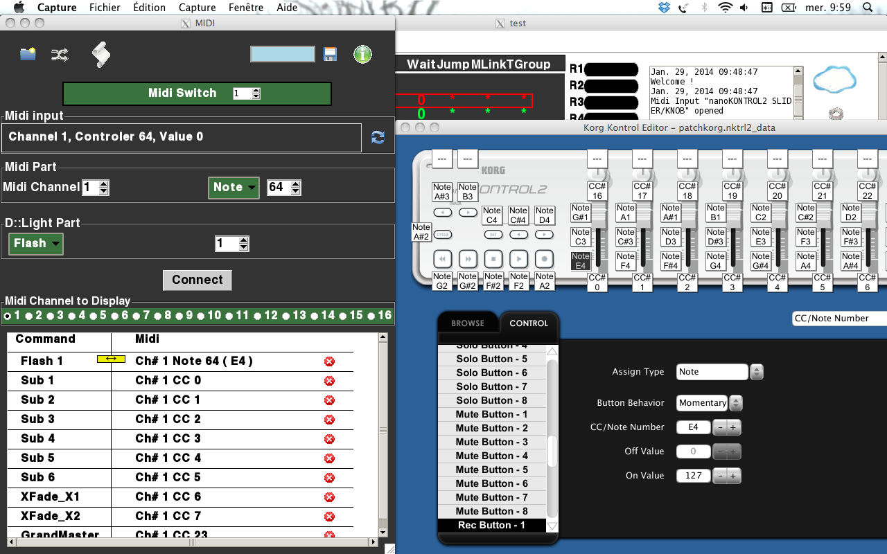 Pour répondre à ta deuxième question, les flashs ne peuvent être assignés qu'à des notes midi et non à des control change. Par défaut, les touches du Nanokontrol sont toutes des control change. Il faut que tu installes le logiciel Korg Kontrol Editor et que tu assignes des notes aux boutons que tu veux utiliser. Tu verras que pour ces boutons Dlight te proposera des flashs, go, go-back ...