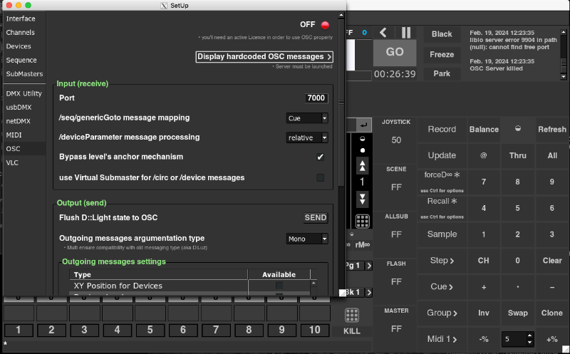 :light, je fait la manip comme d'habitude mais impossible de basculer le petit bouton su setup de off à on. J'ai le message "liblo server error 9904 in path (null) : cannot find free port".