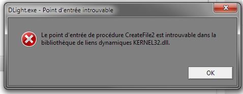 "Le point d'entrée de procédure createFile2 est introuvable dans la bibliotheque de liens dynamiques Kernel32.DLL"