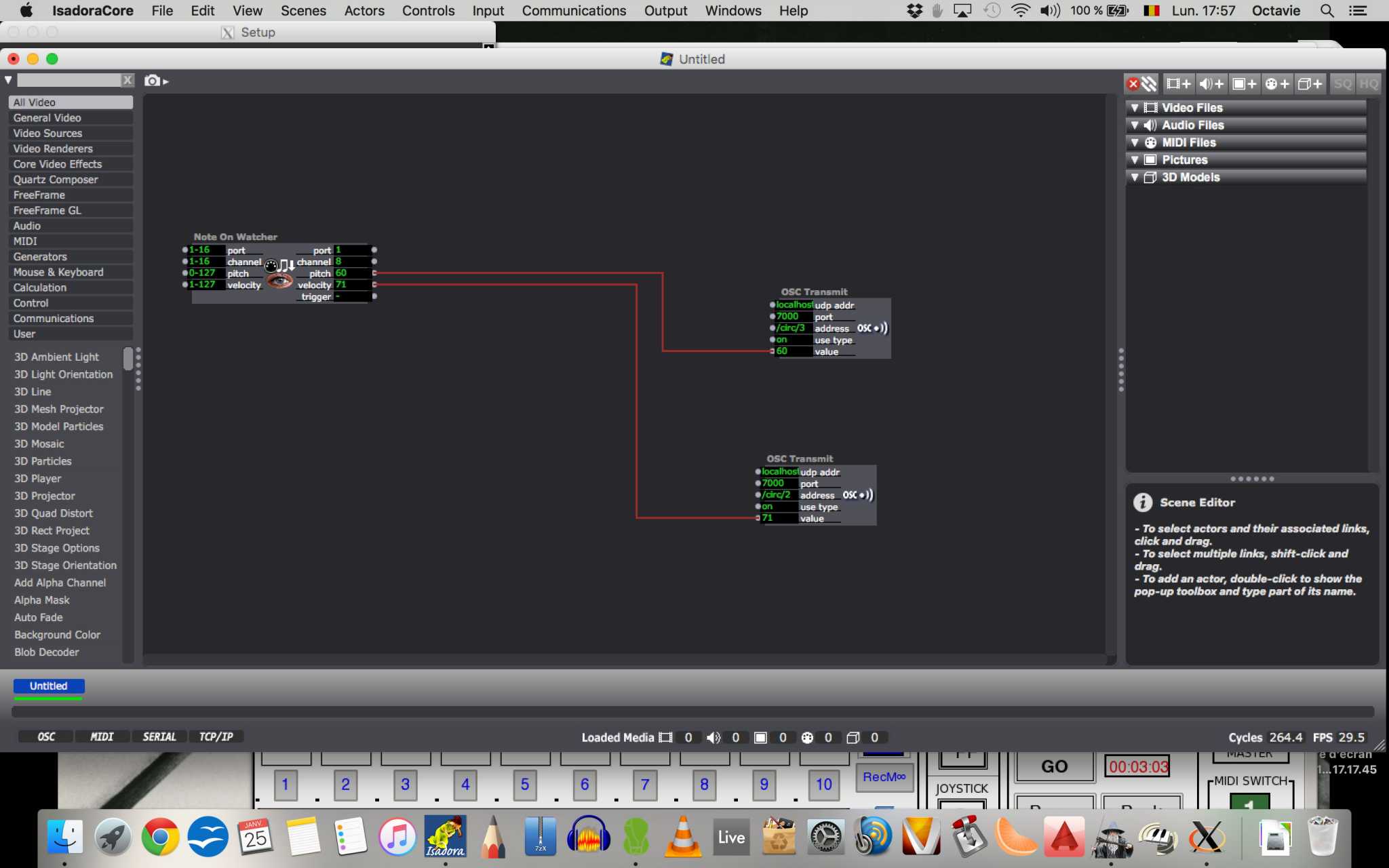 Tu peux me poster les copies d'écran de tes acteurs isadora et de tes pages de préférences osc midi et autre sur isadora.
