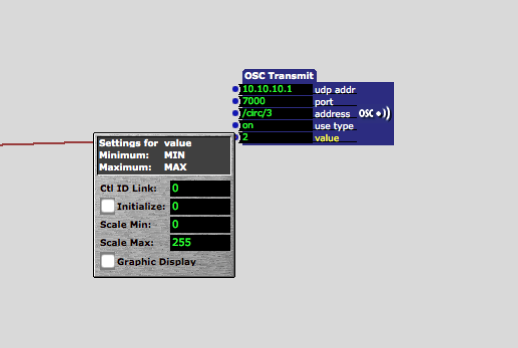 En réalité ce que je cherchais à faire était plutôt de cet ordre là (cf patchizzy.jpg ci joint. en gros j'essaye de faire que la vélocité d'un groupe de note influe sur un paramètre de couleur différent. à noter que je travaillais alors sur le port 8000, mais le problème reste le même. j'avais tous ou certains paramètres par intermittence, donc le problème ne venait pas de là) mais après une plantade de Dlight qui refusait de se relancer, j'ai redémarré et n'ai guère eu le courage de refaire tout le patch isadora (mode démo encore jusque demain...) avant d'avoir régler les problèmes de communication osc.