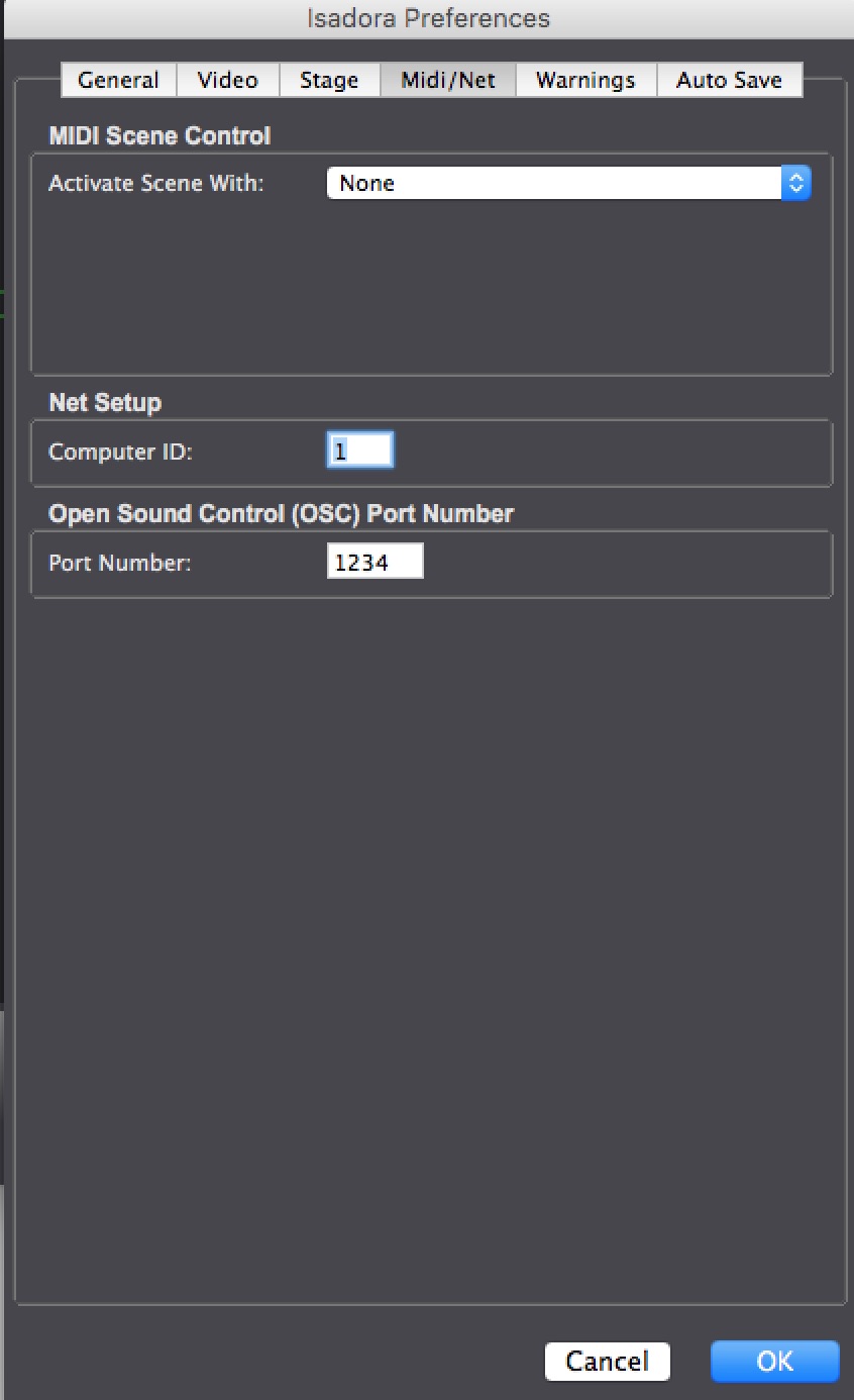 je te mets en pièce jointe les config isadora (j'ai essayé de modifié le port osc en 1234 ou en 7000, mais j'imagine que cette adresse n'est que pour la réception d'information osc) et midi