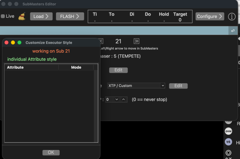 Lorsque j'envoie mes conduites DLight à mes collègues il arrive que les submaster se "désactivent". J'entends par là que le submaster est toujours présent, il a toujours le même nom, il contient la même chose (chase ou preset) mais le monter ne changent rien au niveaux. Et cela autant en montant le sub qu'en l'envoyant via un master link. Si un nouveau Sub est chargé, son contenu fonctionne.