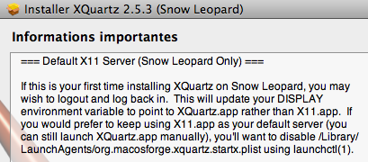 Ce que j'en comprends c'est qu'après l'installation de XQuartz, une variable d'environnement qui s'appelle DISPLAY pointera désormais vers XQuartz.app au lieu de X11.app. Mais que si je préfère continuer d'utiliser X11 au lieu de XQuartz je peux aller changer ça dans le fichier Library/LaunchAgents/org.macosforge.xquartz.stratx.plist en utilisant launchctl(1).