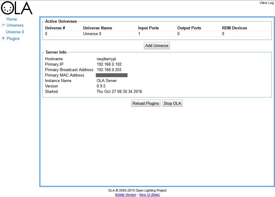 Note : L'univers 1 de D::Light correspond au 0 de OLA, et les 2, 3, 4 aux 1, 2, 3.