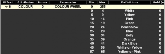 Ce device utilise une roue de couleur. Il faut maintenant configurer la position de chaque couleur sur la plage du canal DMX. Pour cela nous utilisons les Definitions :